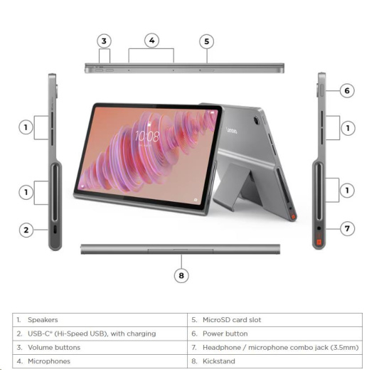 | Standartné porty | 1x USB-C® (Hi-Speed USB / USB 2.0), with charging, digital audio 1x Headphone / microphone combo jack (3.5mm) 1x microSD card slot |