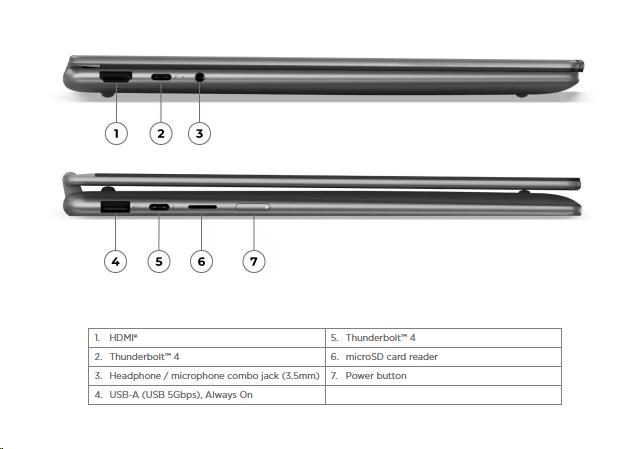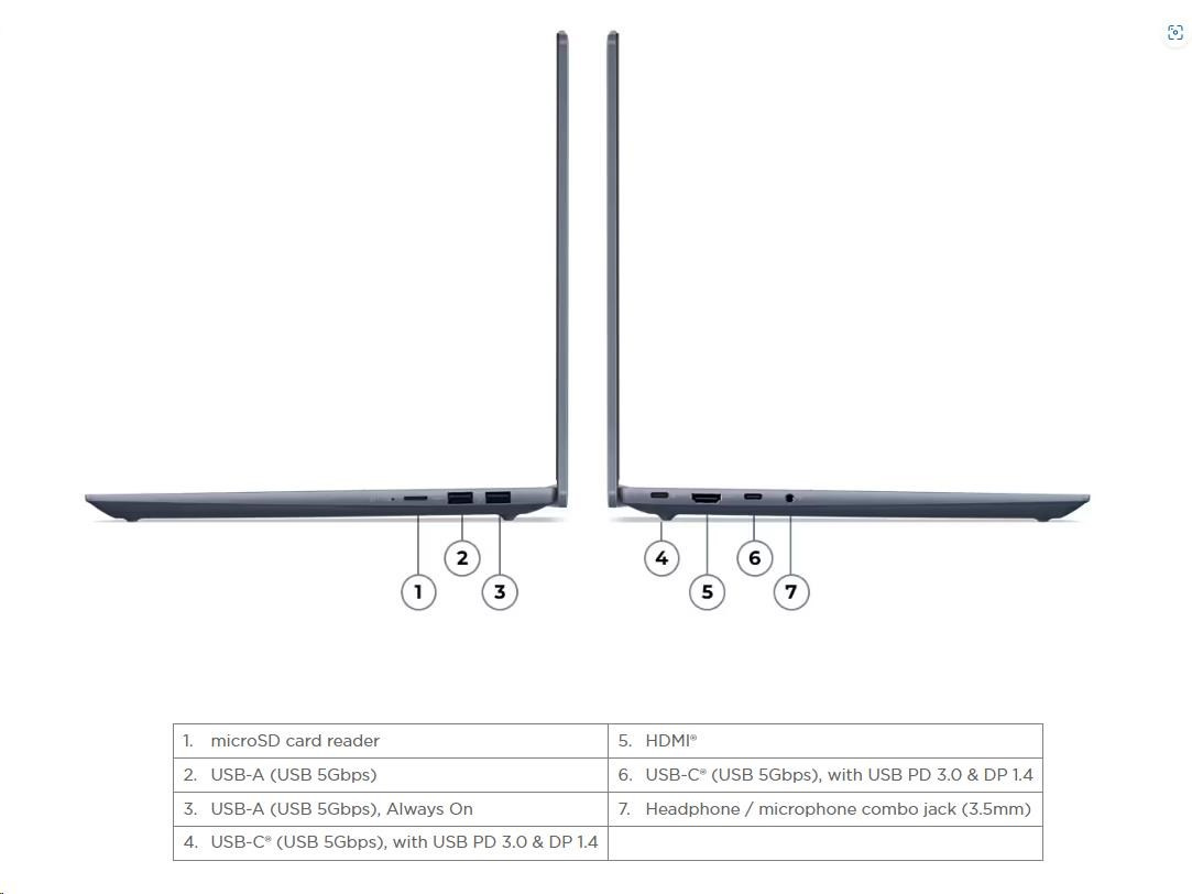 | Standartné porty | 1x USB-A (USB 5Gbps / USB 3.2 Gen 1), Always On 2x USB-C® (Thunderbolt™ 4 / USB4® 40Gbps), with USB PD 3.0 and DisplayPort™ 2.1 1x HDMI® 1.4b 1x Headphone / microphone combo jack (3.5mm) 1x microSD card reader |