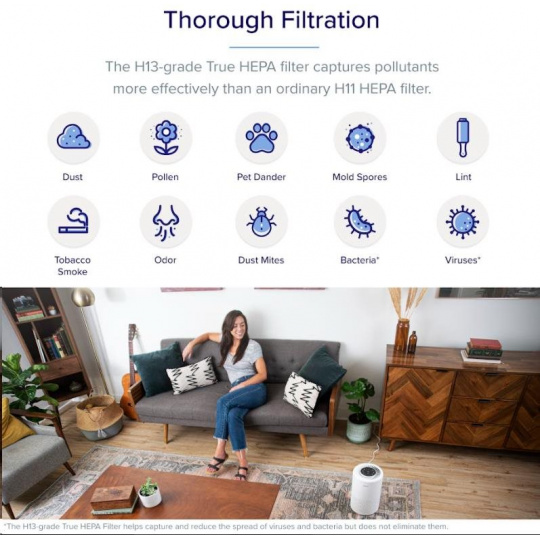 Druhou vrstvou je HEPA filter H13. To odlišuje Levoit od konkurencie, pretože filter HEPA H13 je oveľa kvalitnejší a spoľahlivejší ako bežne používané HEPA H11. Tu sa odfiltrujú jemné prachové častice, pleseň, baktérie, peľ, dymové častice, roztoče a srsť.
