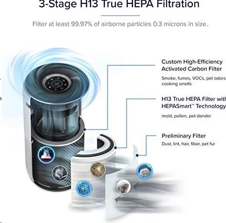 Druhou vrstvou je HEPA filter H13. To odlišuje Levoit od konkurencie, pretože filter HEPA H13 je oveľa kvalitnejší a spoľahlivejší ako bežne používané HEPA H11. Tu sa odfiltrujú jemné prachové častice, pleseň, baktérie, peľ, dymové častice, roztoče a srsť.