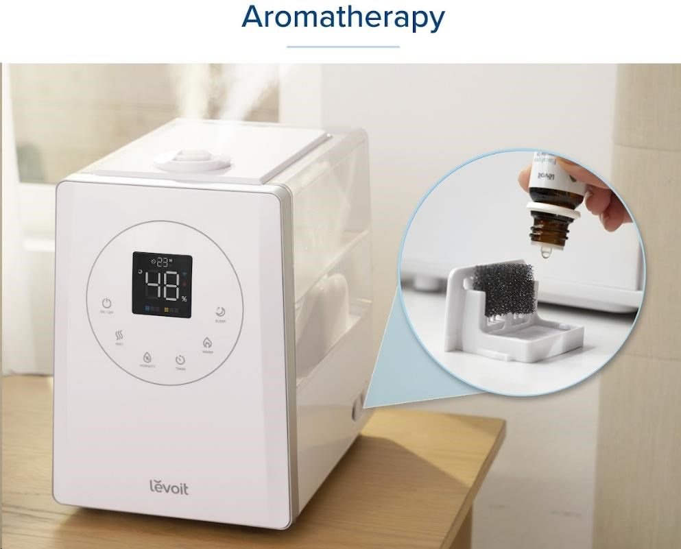 Zvlhčovač Levoit LV600S môžete použiť aj na prevoňanie miestností a vytvoriť tak príjemnú relaxačnú atmosféru. Aromatické oleje sa dávkujú do samostatnej nádobky, čo je lepší a efektívnejší spôsob ich aplikácie. Éterické oleje majú blahodarné účinky na celé ľudské telo. Citrusové vône osviežujú prostredie, levanduľa vám pomôže na upokojenie tela a od stresu, eukalyptus upokojí bolesť hlavy a mäta uvoľní horné cesty dýchacie. Balenie tiež obsahuje 3 aromatické filtre a absorpčný vankúš.