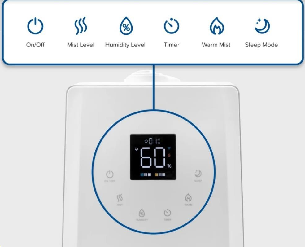 Zvlhčovač vzduchu Levoit LV600S Smart je možné ovládať priamo na prehľadnom podsvietenom LED displeji alebo aj cez aplikáciu na chytrých zariadeniach Apple alebo Android. Alebo si ho môžete dokonca pripojiť do svojho Smart Home a ovládať hlasom cez Google Assistant alebo Amazon Alexa. Senzor vlhkosti zobrazuje vlhkosť v reálnom čase av automatickom režime tak okamžite reaguje na zmeny vlhkosti. Vždy by sa malo jednať o rozmedzie medzi 40 % až 60 %. Cez aplikáciu si môžete informácie kontrolovať alebo si svoje režimy plánovať.