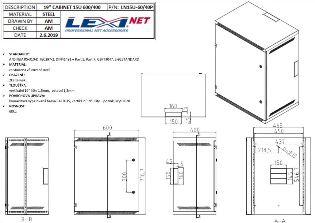 LEXI-Net 15U rack, plná hĺbka plechu 400 mm - ŠTANDARDY: ANSI/EIA RS-310-D, IEC297-2, DIN41491 - časť 1, časť 7, GB/T3047, 2-92STANDARD - MATERIÁL: oceľ valcovaná za studena - UPEVNENIE : 2ks zámok - POVRCHOVÁ ÚPRAVA: vertikálne 19" koľajnice 1,5 mm, ostatné 1,2 mm - povrchová úprava: komaxitová zapečená farba RAL7035, vertikálne 19" koľajnice - pozinkované - NOSNOSNOSŤ: 60 kg ROZMER: Š x V x H 600x720x400 mm..