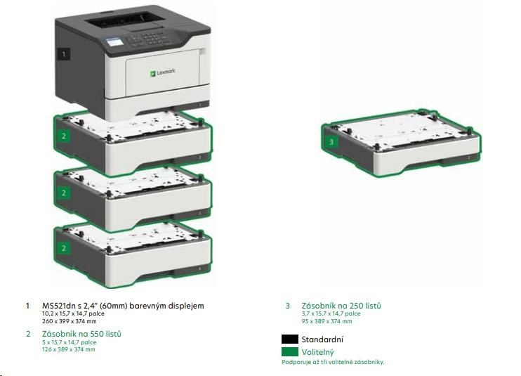 Všeobecné špecifikácie Číslo dielu 36S0310 Monochromatická laserová tlač Technológia Veľkosť pracovnej skupiny Stredná pracovná skupina Displej 2,4" (60 mm) farebný LCD displej Podporované veľkosti médií A6, Oficio, 7 3/4 obálky, 9 obálky, JIS-B5, A4, Legal, A5, Letter, Statement, Executive, Universal, DL obálka, Folio, 10 obálka Manipulácia s papierom Súčasťou balenia je viacúčelový podávač na 100 listov, integrovaný duplex, výstupný zásobník na 150 listov, integrovaný zásobník na 250 listov Štandardné porty Gigabit Ethernet (10/100/1000), port USB 2.0 Špecifikácia Hi-Speed Certified (Type B) Rozmery (V x H x Š) 260 x 399 x 374 mm Hmotnosť 14.1 kg Rozmery balenia (v x h x š) 376 x 430 x 470 mm Hmotnosť balenia 15.99 kg Tlač Rýchlosť tlače 44 str./min.1 Rýchlosť obojstrannej tlače) Až: čiernobielo: 22 str./min. (A4) Čas prvej čiernobielej strany: 6.0 sekúnd Rozlíšenie čiernobielej tlače: 1200 x 1200 dpi, kvalita 2400, 300 x 300 dpi, 600 x 600 dpi, kvalita 1200 Obojstranná obojstranná tlač: integrovaná obojstranná tlačová plocha 4.0 mm od všech okrajů (včetně) Manipulace s papírem Podporované typy médií Papírové štítky, Tvrdý papír, Obyčejný papír, Transparencies, Envelopes, vinylové štítky, viz Card Stock & Label Guide Možnost dokončování No Počet vstupů papíru standardně: 2 maximálně: 5 Kapacita vstupu papíru standardně: 350 stránek maximálně: 2000 stránek 350 stránek Kapacita výstupu papíru Až: standardně: 150 stránek maximálně: 150 stránek Podporovaný rozsah gramáže papíru 60 - 120 g/m2 (standardní zásobník) 60 - 216 g/m2 (multifunkční zásobník) Doporučený měsíční objem tisku 2000 - 15000 stránek2 Maximální měsíční funkční cyklus 120000 stránek za měsíc3 Kazety a zobrazování Počty vytištěných stránek u kazet pro tiskárny až: 15,0004 -page High Yield Cartridge Kazeta na 6 0004 stran Extra vysokokapacitní kazeta na 20 0004 stran Ultra vysokokapacitní kazeta na 25 0004 stran Odhadovaný počet vytištěných stránek na zobrazovací válec M: 60000 strán pri tlači 3 normálnych strán/A4 na tlačovú úlohu a pri 5 % pokrytí5 Tlačové kazety dodávané s výrobkom Prvá tonerová kazeta na 5 0000 strán, zahrnutá vo vratnom programe Náhradné kazety: Výrobok funguje len s náhradnými kazetami určenými na použitie v konkrétnej zemepisnej oblasti. Pozri www.lexmark.com/regions, kde nájdete ďalšie podrobnosti. Hardvér Procesor 1.0 GHz MHz Pamäť štandardná: 512 MB maximálna: 512 MB Pevný disk nie je k dispozícii Tlačový jazyk štandardný: PCL 5e Emulácia, PCL 6 Emulácia, Microsoft XPS (XML Paper Specification), Personal Printer Data Stream (PPDS), PostScript 3 Emulácia, PDF 1.7 emulácia, Direct Image, AirPrint™ Písma a znakové sady 2 bitmapové písma PCL, OCR-A, OCR-B škálovateľné písma PCL 5e, Ďalšie informácie nájdete v Technickej referencii., 84 škálovateľných písiem PCL, 91 škálovateľných písiem PostScript, 3 z 9 škálovateľných písiem PCL 5e v úzkej, bežnej a širokej verzii, 5 bitmapových písiem PPDS, 39 škálovateľných písiem PPDS Dotykový displej Nie Možnosti pripojenia Priame USB Nie Ethernet Áno Bezdrôtové bezdrôtové príslušenstvo Podpora sieťových protokolov TCP/IP IPv6, TCP/IP IPv4, AppleTalk™, TCP, UDP Metódy sieťovej tlače LPR/LPD, Pull Printing, Microsoft Web Services WSD, Secure IP (Port 96xx), FTP, TFTP, Enhanced IP (Port 9400), ThinPrint .integrácia tlače, IPP 1.0, 1.1, 2.0 (Internet Printing Protocol) Protokoly správy siete DHCP, APIPA (AutoIP), mDNS, IGMP, WINS, DDNS, SNMPv3, SNMPv1, SNMPv2c, Telnet, NTP, ICMP, HTTP, DNS, ARP, HTTP (SSL6 /TLS), Finger Zabezpečenie siete SNMPv3, 802.1x Autentifikácia: MD5, MSCHAPv2, LEAP, PEAP, TLS, TTLS Voliteľné sieťové porty Marknet N8370 WiFi Option Podporované operačné systémy Podporované operačné systémy Microsoft Windows Windows 10, Windows 8.1, Windows 8, Windows 8 x64, Windows 7 x64, Windows 8.1 x64, Windows 7 Podporované operačné systémy Apple Apple OS X (10.6, 10.7, 10.8, 10.9, 10.10, 10.11, 10.12) Podporované operačné systémy Linux Debian GNU/Linux 7.0, 8.0, Ubuntu 16.04 LTS, Fedora 23, 24, openSUSE Linux 42.3, Red Hat Enterprise Linux WS 6, 7, openSUSE Linux 13.2, SUSE Linux Enterprise Server 10, 11, 12 Citrix MetaFrame Microsoft Windows 2000 Server s terminálovými službami s prezentačným serverom Citrix MetaFrame XP alebo Citrix MetaFrame Presentation Server 3.0., Microsoft Windows Server 2012 s aplikáciou Citrix XenApp 6.0, 6.5, Microsoft Windows 2000 Server s terminálovými službami a Citrix Presentation Server 3.0, 4.0, Microsoft Windows 2000 Server s terminálovými službami a Citrix Presentation Server 4.0 Podporované operačné systémy Novell Novell Open Enterprise Server na SUSE Linux Enterprise Server, Novell NetWare 5.1(SP 6+), 6.0(SP 3+) s Novell Distributed Print Services (NDPS), Novell Open Enterprise Server 2 SP2 na SuSE Linux Enterprise Server 10 SP3 3, Novell NetWare 6.5 Open Enterprise Server, Novell Open Enterprise Server 11 na SUSE Linux Enterprise Server 11, Novell Open Enterprise Server 2 na SUSE Linux Enterprise Server 10 SP4 Podporované operačné systémy UNIX Sun Solaris x86 10, 11, Sun Solaris SPARC 10, 11, IBM AIX 6.1, 7.1 Elektrická energia a prevádzka ENERGY STAR Áno Typická spotreba energie podľa Energy Star 1.8 kilowatthodín týždenne Hlučnosť / Hladina hluku v prevádzke 14 dB (Idle) 56 dB (Print) Hladina hluku v pracovnom režime obojstrannej tlače: 55 dB Priemerná spotreba energie v režime hibernácie / Priemerná spotreba energie v režime spánku / Priemerná spotreba energie v režime Ready / Priemerná spotreba energie pri tlači 0.1 watt 2.0 wattov 8 wattov 620 wattov Predpísané prevádzkové podmienky Vlhkosť: 8 až 80 % relatívnej vlhkosti Teplota: 16 až 32 °C Nadmorská výška: 0 až 5000 metrov C