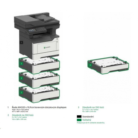 Obsah balenia Multifunkčná laserová tlačiareň Lexmark MX521de Tonerová kazeta Štartovací program na vrátenie až 6 000 strán* Program na vrátenie Displejová jednotka CD Softvér a dokumentácia Inštalačná príručka alebo dátový list (sieťové a miestne pripojenie) Napájacie káble Vyhlásenie o obmedzenej záruke Karta stability a bezpečnostných údajov alebo brožúra Informácie o programe zberu kaziet Lexmark Obsah balenia sa môže líšiť podľa krajiny alebo predajcu. Informácie sa môžu zmeniť bez predchádzajúceho upozornenia. *Priemerný počet vytlačených strán pri nepretržitej jednostrannej tlači je 6 000 štandardných strán. Uvedená hodnota kapacity je v súlade s normou ISO/IEC 19752. Sieťový kábel (Ethernet), kábel USB alebo paralelný kábel nie sú súčasťou dodávky. Všeobecné špecifikácie Číslo dielu 36S0810 Technológia tlače Monochromatický laser Funkcie Kopírovanie Farebné skenovanie Tlač Sieťové skenovanie Veľkosť pracovnej skupiny Stredná pracovná skupina Displej Lexmark e-Task 4,3-palcový (10,9 cm) farebný dotykový displej Podporované veľkosti médií A6, Oficio, 7 3/4 obálky, 9 obálky, JIS-B5, A4, Legal, A5, Letter, Statement, Executive, Universal, DL obálka, Folio, 10 obálka Manipulácia s papierom Súčasťou balenia je viacúčelový podávač na 100 listov, integrovaný duplex, výstupný zásobník na 150 listov, integrovaný zásobník na 250 listov Štandardné porty Gigabit Ethernet (10/100/1000), predný USB 2.0 Špecifikácia Hi-Speed Certified (typ A), zadný port certifikovaný USB 2.0 Hi-Speed (typ A), USB 2.0 Špecifikácia Hi-Speed Certified (Type B), Jeden interný slot na kartu Rozmery (V x H x Š) 477 x 489 x 429.5 mm Hmotnosť 20.6 kg Rozmery balenia (v x h x š) 614 x 511 x 576 mm Hmotnosť balenia 23.72 kg Kopírovanie Rýchlosť kopírovania Až: čiernobielo: 44 kópií/min.1 (A4) Rýchlosť obojstranného kopírovania Až: čiernobielo: 23 str./min. (A4) Čas prvej kópie ČB: 6 sekúnd Rozsah zväčšenia/zmenšenia 25 - 400 % Faxovanie Rýchlosť modemu N/A kbps Rýchlosť prenosu faxu N/A Tlač Rýchlosť tlače 44 str./min. Rýchlosť obojstrannej tlače) Až: čiernobiela: 22 str./min. (A4) Čas vytlačenia prvej strany čiernobielo: 6 sekúnd Rozlíšenie tlače čiernobielo: 1200 x 1200 dpi, kvalita 2400, 600 x 600 dpi, kvalita 1200 Obojstranná obojstranná tlač: integrovaná obojstranná tlač Oblasť tlače 4.0 mm od všetkých okrajov (vrátane) Skenovanie Typ skenera / Skenovanie s automatickým podávačom dokumentov Plochý skener s ADF RADF (reverzný duplex) Skenovacia plocha mm: 215.9 x 355.6 mm (maximálne) A4/Ltr Rýchlosť skenovania Až: čiernobielo: 42 / 45 str./min. farebne: 20 / 22 str./min. A4/Ltr Rýchlosť skenovania Až: obojstranne: 20 / 20 str./min.5 / 10.5 strán za minútu (farebne) Technológia skenovania CIS Rozlíšenie skenovania až 600 X 600 ppi (farebne) Formáty skenovaných súborov Odosielanie ako: XPS, TIFF, Archívny PDF (A-1a, A-1b), Zabezpečený PDF, PDF, JPEG, JPG Ciele skenovania E-mail, Lexmark Document Solutions Suite (LDSS), USB alebo počítač pripojený k sieti, USB Flash disk, FTP ADF Automatický podávač dokumentov na 50 listov Vstupná kapacita papiera / Výstupná kapacita papiera Až: APL: 50 strán APL: 50 A4/Ltr Rýchlosť skenovania 20 / 20 strán za minútu 10.5 / 10.5 stran za minutu A4/Ltr Rychlost skenování 42 / 45 stran za minutu 20 / 22 stran za minutu Manipulace s papírem Podporované typy médií Papírové štítky, Tvrdý papír, Obyčejný papír, Transparencies, Envelopes, vinylové štítky, viz Card Stock & Label Guide Možnost dokončování No Počet vstupů papíru standardně: 2 maximálně: 5 Kapacita vstupu papíru standardně: 350 stránek maximálně: 2000 stránek 350 stránek Kapacita výstupu papíru Až: standardně: 150 stránek maximálně: 150 stránek Podporovaný rozsah gramáže papíru 60 - 120 g/m2 (standardní zásobník) Doporučený měsíční objem tisku 2000 - 15000 stránek2 Maximální měsíční funkční cyklus 120000 stránek za měsíc3 Kazety a zobrazování Počty vytištěných stránek u kazet pro tiskárny až: 15,0004 -page High Yield Cartridge Kazeta na 6 0004 stran Extra vysokokapacitní kazeta na 20 0004 stran Ultra vysokokapacitní kazeta na 25 0004 stran Odhadovaný počet vytištěných stránek na zob: 60000 strán pri tlači 3 normálnych strán/A4 na tlačovú úlohu a pri 5 % pokrytí5 Tlačové kazety dodávané s výrobkom Prvá tonerová kazeta na 6 0000 strán, zahrnutá vo vratnom programe Náhradné kazety: Výrobok funguje len s náhradnými kazetami určenými na použitie v konkrétnej zemepisnej oblasti. Pozri www.lexmark.com/regions, kde nájdete ďalšie podrobnosti. Hardvér Procesor Dual Core, 1000 MHz Pamäť štandardná: 1024 MB maximálna: 1024 MB Pevný disk nie je k dispozícii Tlačový jazyk štandardný: PCL 5e Emulácia, PCL 6 Emulácia, Microsoft XPS (XML Paper Specification), Personal Printer Data Stream (PPDS), PostScript 3 Emulácia, PDF 1.7 emulácia, Direct Image, AirPrint™ Písma a znakové sady 2 bitmapové písma PCL, OCR-A, OCR-B škálovateľné písma PCL 5e, Ďalšie informácie nájdete v Technickej referencii., 84 škálovateľných písiem PCL, 91 škálovateľných písiem PostScript, 3 z 9 škálovateľných písiem PCL 5e v úzkej, bežnej a širokej verzii, 5 bitmapových písiem PPDS, 39 škálovateľných písiem PPDS Dotykový displej Áno Možnosti pripojenia Priame USB Áno Ethernet Áno Bezdrôtové Bezdrôtové príslušenstvo Podpora sieťových protokolov TCP/IP IPv6, TCP/IP IPv4, AppleTalk™, TCP, UDP Metódy sieťovej tlače LPR/LPD, Direct IP (Port 9100), Pull Printing, Microsoft Web Services WSD, Secure IP (Port 96xx), FTP, TFTP, Enhanced IP (Port 9400), ThinPrint .integrácia tlače, IPP 1.0, 1.1, 2.0 (Internet Printing Protocol) Protokoly správy siete DHCP, APIPA (AutoIP), BOOTP, R