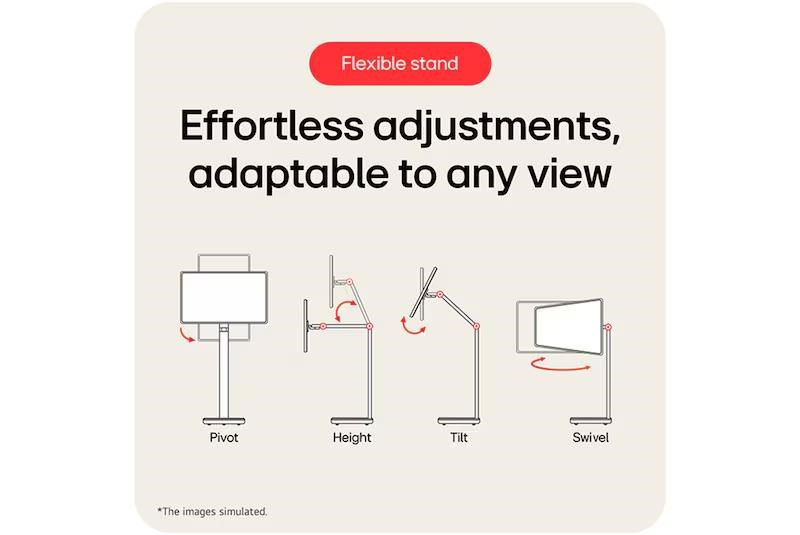 Náš chytrý monitor je vybavený flexibilným stojanom s torzným pántom, ktorý umožňuje nastavenie náklonu, otáčania, výšky aj režimu na výšku pre jednoduché prispôsobenie pozorovacieho uhla. Silná štvorcová základňa zabezpečuje stabilitu a elegantné šedo-biele prevedenie sa hodí do každého interiéru – doma aj v práci.