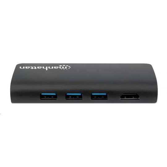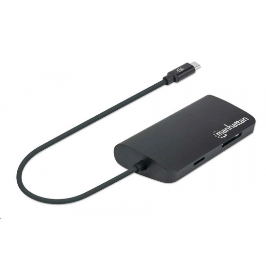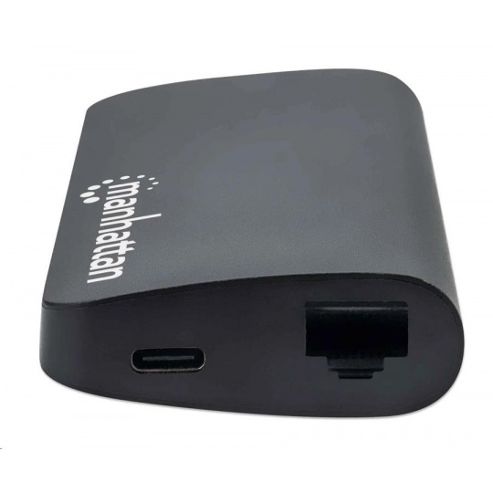 USB 3.2 Gen 1 Type-C Male to HDMI(4K@30Hz) Female, tri porty USB-A SuperSpeed, USB-C Power Delivery (PD 3.0) Port, gigabitový port RJ45 a čítačka kariet SD/MicroSD; hliník, čierna farba