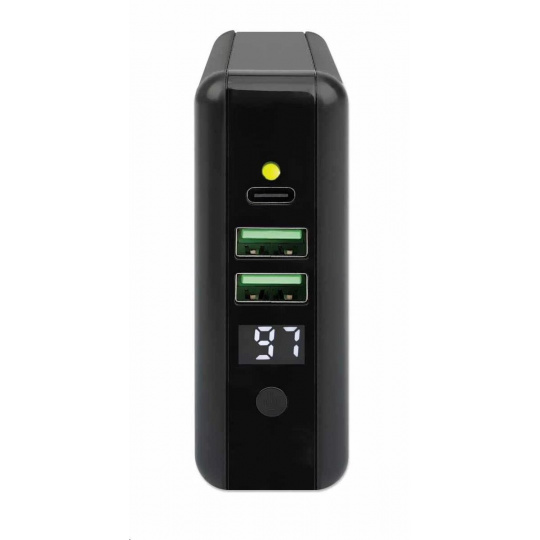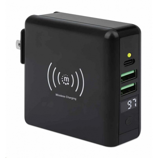 Cestovná sieťová nabíjačka a powerbanka Manhattan 4 v 1 s kapacitou 8 000 mAh vám poskytne neuveriteľne užitočné funkcie v jednom zariadení. Používajte ju ako nástennú nabíjačku USB na nabíjanie smartfónov, tabletov, elektronických čítačiek, slúchadiel a ďalších zariadení z dvoch portov USB-A a jedného portu USB-C s výkonom na port až 5 V/2.4 A. Môžete tiež úplne vynechať káble a nabíjať kompatibilné mobilné zariadenia na 5 W bezdrôtovej nabíjacej podložke. Pre ešte väčšie pohodlie vám tento univerzálny akumulátor umožňuje nabíjať na cestách bez pripojenia do zásuvky, pretože je to zároveň powerbanka s kapacitou 8 000 mAh. Praktický digitálny číselný displej vám umožní kedykoľvek skontrolovať zostávajúci stav batérie. Powerbanku môžete dobíjať priamo cez sieťovú zásuvku alebo cez port USB-C. Ak cestujete do zahraničia, určite sa vám bude páčiť skladacia zástrčka pre USA a vymeniteľné zástrčky pre Veľkú Britániu a EÚ, ktoré vám umožnia nabíjať zariadenia v mnohých regiónoch, ktoré ponúkajú tieto typy zásuviek.