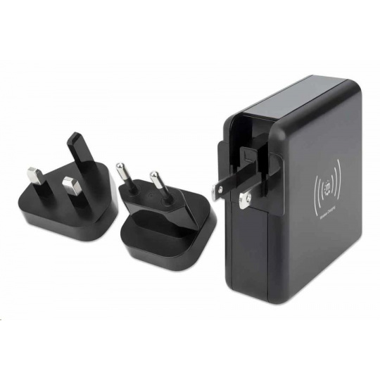 Cestovná nabíjačka a powerbanka Manhattan, 4 v 1, 8.000 mAh, vymeniteľné zástrčky US/EU/UK, čierna