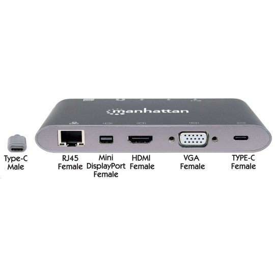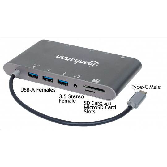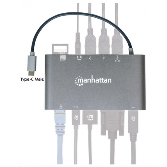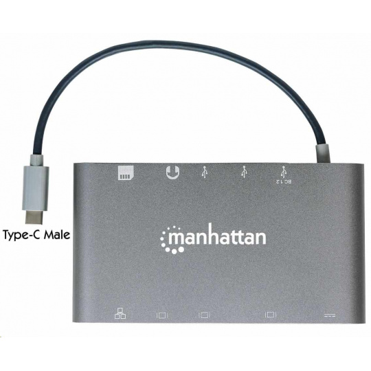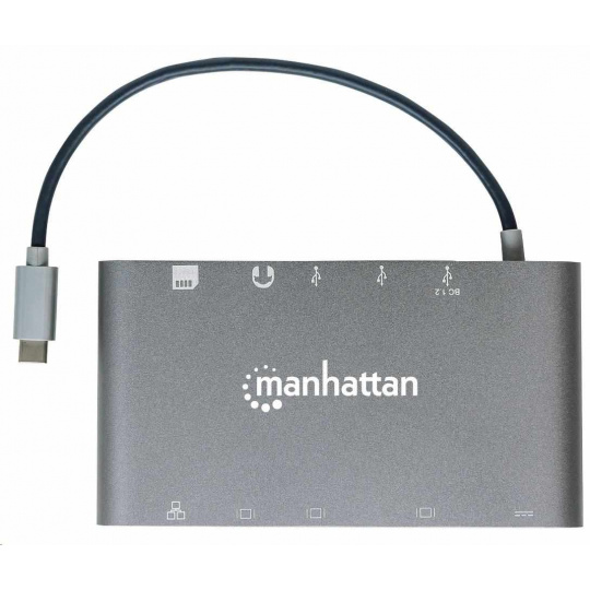 MANHATTAN Dokovacia stanica USB-C na HDMI, Mini DP, VGA, 3xUSB 3.0, port USB-C PD, RJ 45, čítačka kariet, 3,5 mm