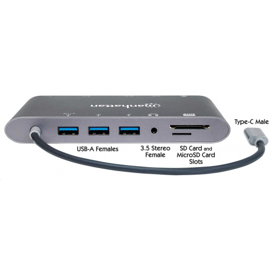 Dokovacia stanica Manhattan SuperSpeed USB-C na 7 v 1 vytvára rýchle, jednoduché a pohodlné prepojenie medzi novšími zdrojmi médií vybavenými rozhraním USB typu C (počítače, tablety, smartfóny atď.) a existujúcim displejom HDMI/Mini DP/VGA (monitory, projektory atď.) v režime zrkadlového alebo rozšíreného zobrazenia. Vytvorte minipracovnú stanicu pridaním ľubovoľného rozhrania USB 3.0 (a staršie), ako je myš, klávesnica, rozbočovač, externé pamäťové zariadenie a ďalšie, s integrovanými portami USB-A, gigabitovým sieťovým pripojením, 3.5 mm Stereo a slot na karty SD a Micro SD, a to všetko pri nabíjaní zariadenia cez port USB-C.