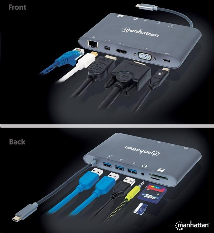 Dokovacia stanica Manhattan SuperSpeed USB-C na 7 v 1 vytvára rýchle, jednoduché a pohodlné prepojenie medzi novšími zdrojmi médií vybavenými rozhraním USB typu C (počítače, tablety, smartfóny atď.) a existujúcim displejom HDMI/Mini DP/VGA (monitory, projektory atď.) v režime zrkadlového alebo rozšíreného zobrazenia. Vytvorte minipracovnú stanicu pridaním ľubovoľného rozhrania USB 3.0 (a staršie), ako je myš, klávesnica, rozbočovač, externé pamäťové zariadenie a ďalšie, s integrovanými portami USB-A, gigabitovým sieťovým pripojením, 3.5 mm Stereo a slot na karty SD a Micro SD, a to všetko pri nabíjaní zariadenia cez port USB-C.