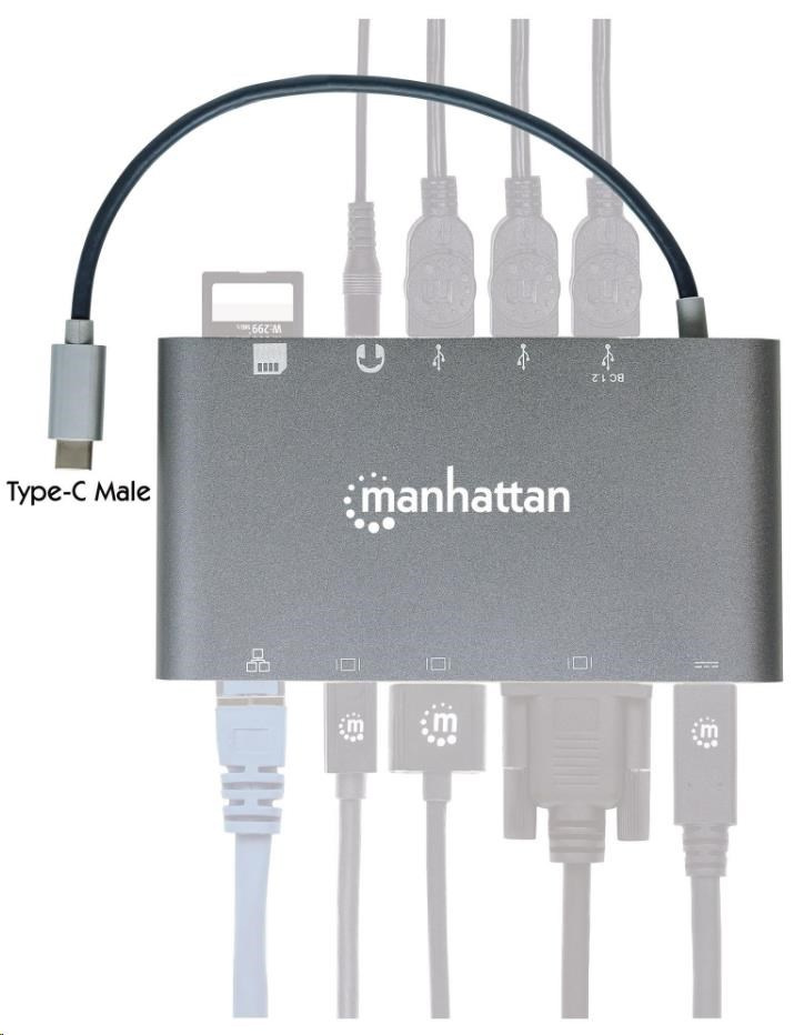 MANHATTAN Dokovacia stanica USB-C na HDMI, Mini DP, VGA, 3xUSB 3.0, port USB-C PD, RJ 45, čítačka kariet, 3,5 mm