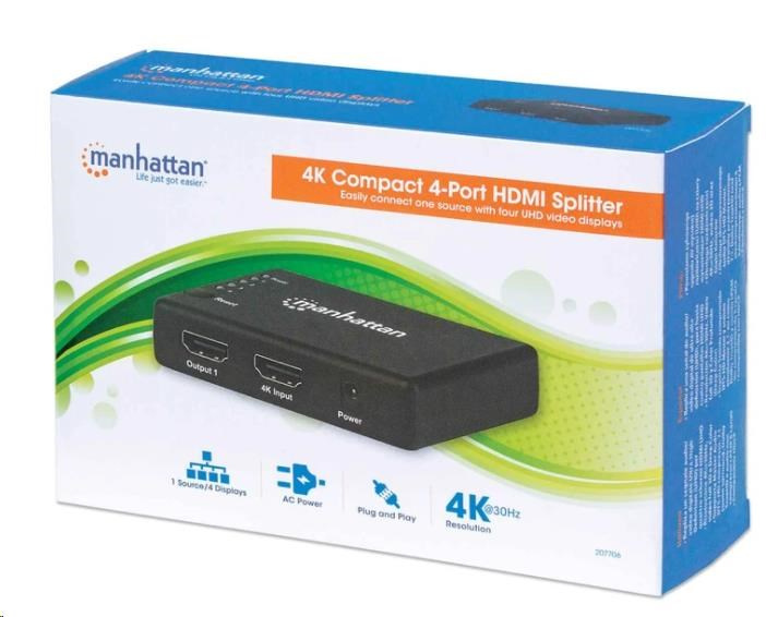 Manhattan 4K 4-portový rozdeľovač HDMI so zabudovaným zosilňovačom prenáša signál 4K HDMI z jedného zdroja UHD až na štyri displeje UHD.