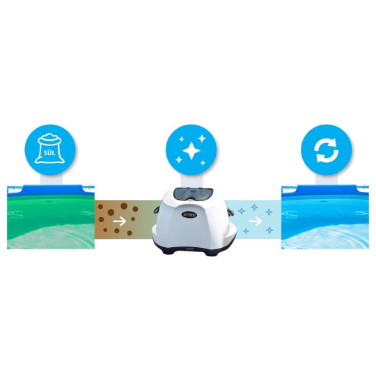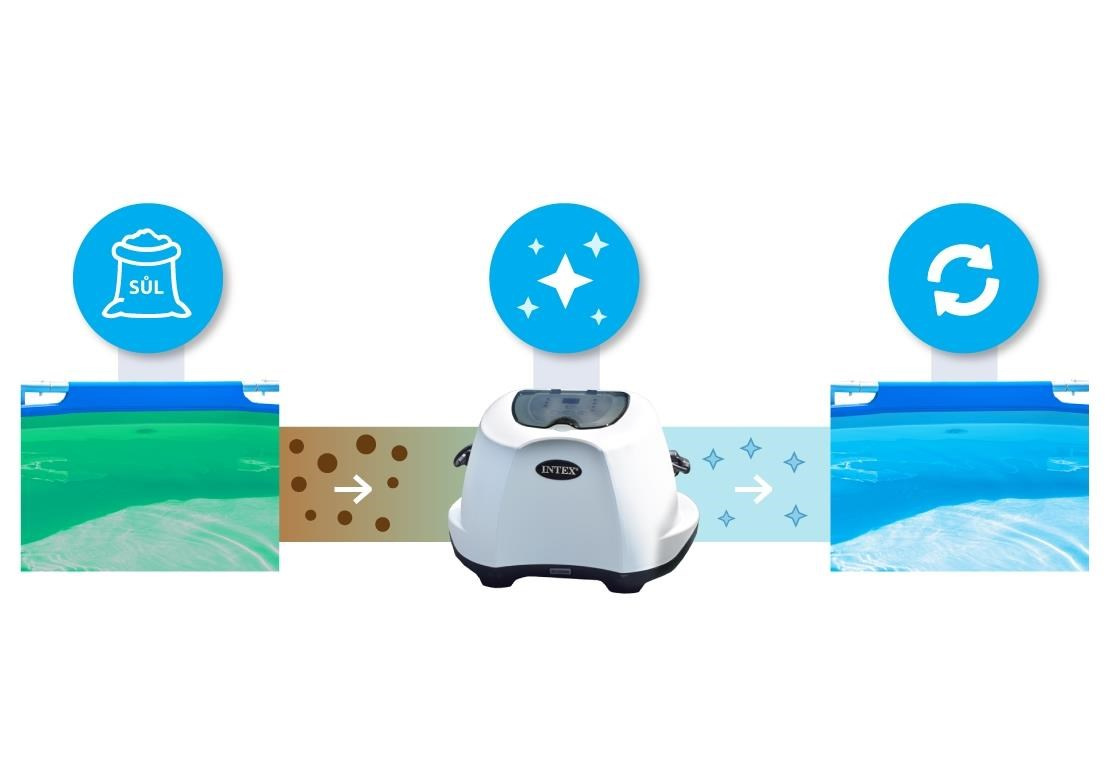 Spustením filtračného systému prechádza slaná voda cez chlorinátor, ktorý premieňa rozpustenú soľ na chlór. Vzniknutý chlór okamžite dezinfikuje vodu.