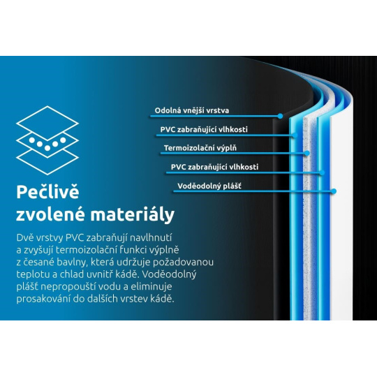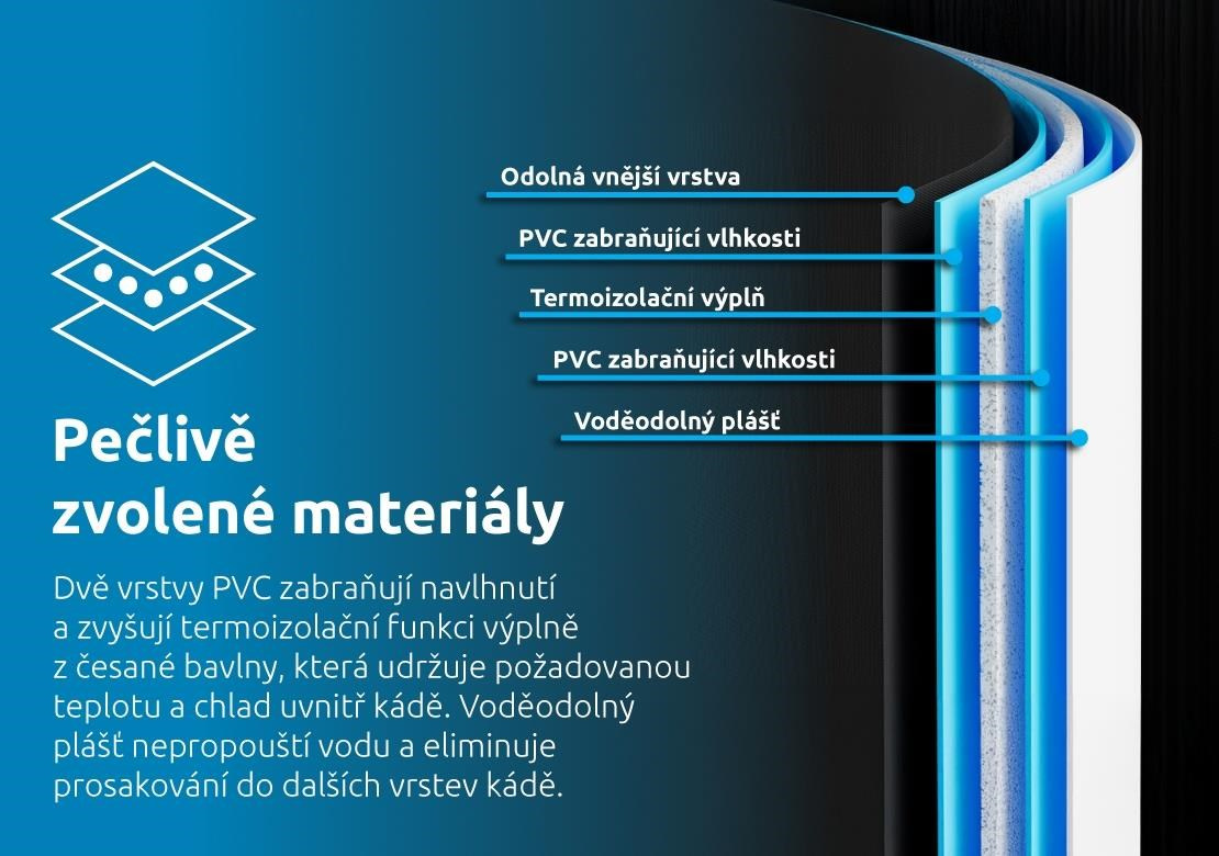 Dve vrstvy PVC a výplň z česanej bavlny zabezpečujú perfektnú tepelnú izoláciu a zabraňujú navlhnutiu. Vodotesný plášť navyše eliminuje prosakovanie a udržiava obsah vane v perfektnom stave.
