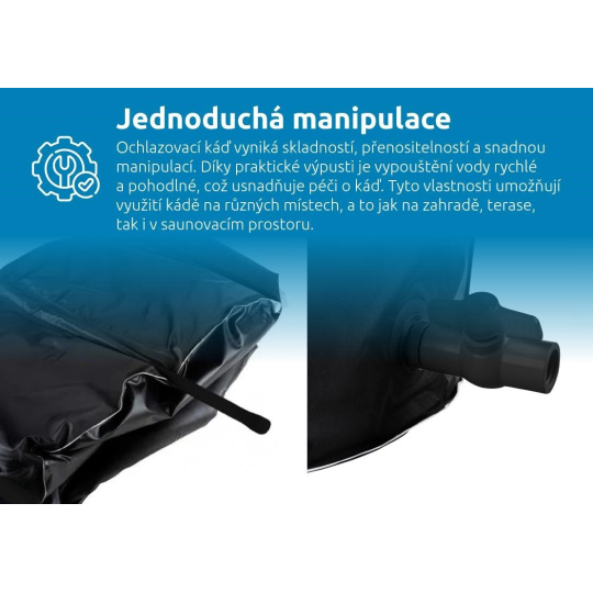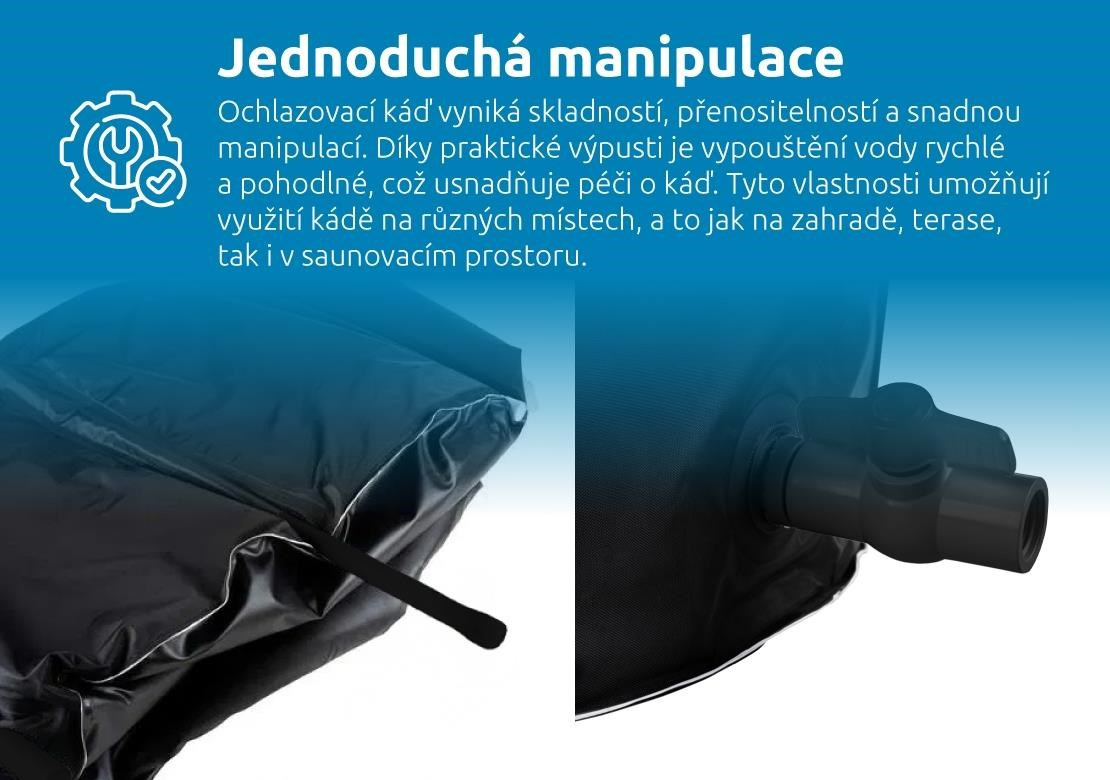 Vďaka odolnosti voči teplotám v rozmedzí -20 °C až 50 °C môžete vaňu využívať po celý rok, bez ohľadu na počasie. Praktická vypúšťacia zátka umožňuje rýchle vypustenie vody, zatiaľ čo vonkajší kryt chráni vaňu pred nečistotami, prachom a hmyzom. Termokryt navyše udržiava optimálnu teplotu vody, minimalizuje tepelné straty a zvyšuje energetickú úsporu. Tieto vlastnosti spolu s jednoduchou manipuláciou robia z ochlazovacej vane ideálneho spoločníka na záhradu, terasu aj do saunového priestoru.