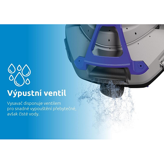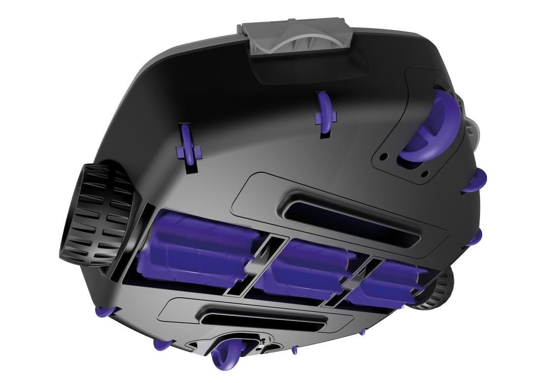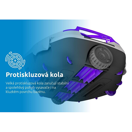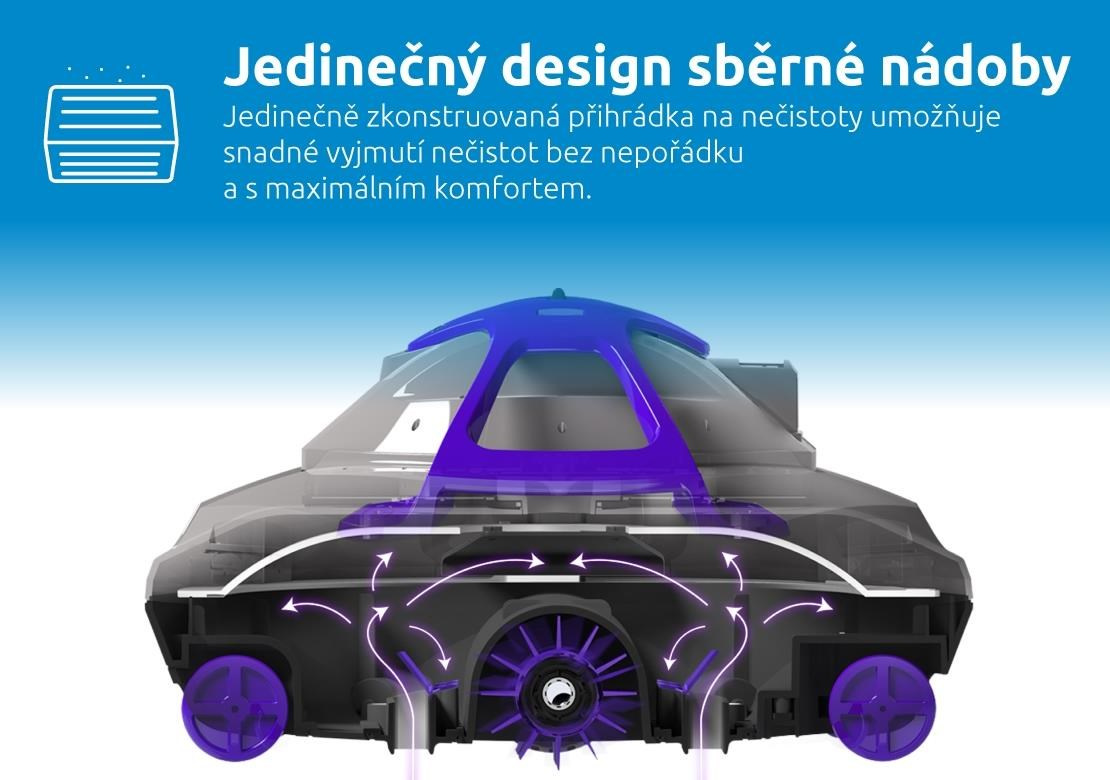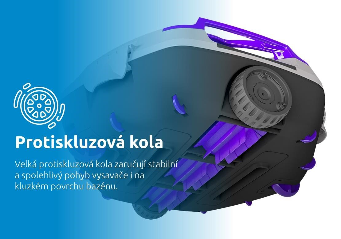 Veľké protisklzové kolesá zabezpečujú stabilný a spoľahlivý pohyb vysávača aj na klznkom povrchu bazéna. Integrovaný chytrý senzor efektívne otáča vysávač pri stene bazéna a tým zabezpečuje dôkladné čistenie celého dna. Jedinečne konštruovaná priehradka na nečistoty umožňuje jednoduché vybratie nečistôt bez neporiadku a s maximálnym komfortom.