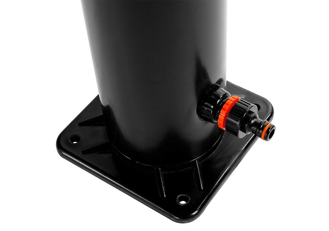 Záhradná sprcha UNO je určená na vonkajšie použitie na zabezpečenie ohrevu vody úplne zadarmo pomocou ekologického zdroja ohrevu - slnečnej energie, pričom jej telo zároveň slúži ako solárny kolektor. Pojme až 20 l vody. Na sprchovanie musí byť záhradná sprcha stále pripojená na vodovodný rad. Ak nie je pripojená, nie je možné sa sprchovať. Horná sprchová hlavica je vybavená kĺbom na polohovanie. Ak je sprcha odpojená a je uzavretý ventil, nedochádza k úniku vody. Sprcha sa ukotví pomocou 4 skrutiek (nie sú súčasťou balenia) pevne k zemi, čím je zabezpečená jej perfektná stabilita.