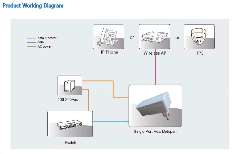 axLink PI15S je vysokokvalitný gigabitový POE injektor s jedným výstupným portom POE na napájanie 802.3af a maximálnou spotrebou energie do 15,4 W. Injektor PoE sa pripája priamo na vstup. Napájanie je vedené po vodičoch 4,5 (+) a 7,8 (-). Napájací injektor je vhodný najmä na napájanie IP kamier, telefónov VoIP atď...