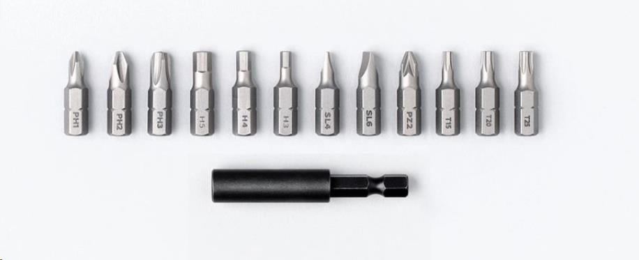 - Obsah balenia: 1x Skrutkovač, 1x Úložný vak, 1x Návod, 1x Držiak na bity, 1x Predlžovacia tyč, 12x Bit, 1x Nabíjací kábel