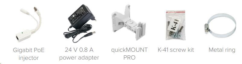 Balenie obsahuje: mANTBox 2 12s, gigabitový injektor PoE, napájací zdroj, montážnu sadu na stožiar, quickMOUNT pre