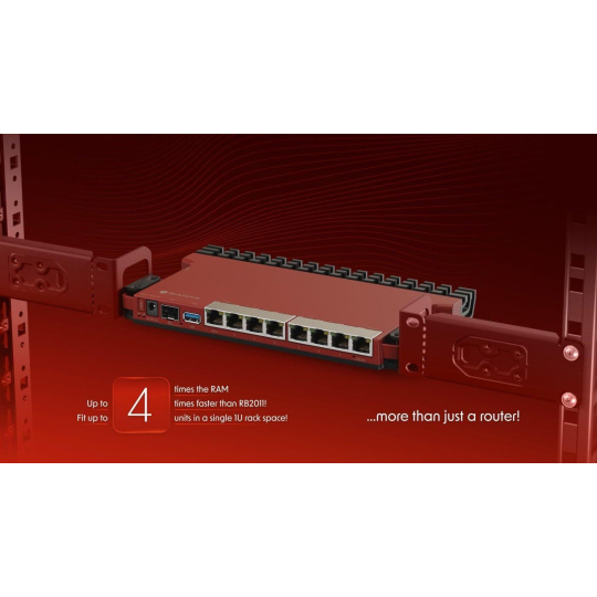 Popis produktu Nástupce legendární produktové řady RB2011 je tu! L009UiGS-RM je perfektní malé desktop/rackmount řešení s nízkými náklady na pořízení, požadavkem na vysoký výkon a pasivním chlazení. Zařízení je vybaveno výkonným dual-core IPQ-5018 procesorem s taktem 800 MHz, 512 MB RAM, 128 MB uložištěm, 8x Gigabit LAN s podporou PoE-IN (24 - 56V pasive nebo 802.af) na prvním a PoE-Out (pouze pasive) na posledním portu, plnohodnotným USB 3.0 portem (například pro připojení LTE modemu), sériovým portem a optickým SFP portem s rychlostí až 2.5Gbps. Klíčové vlastnosti • (8) Gigabit ethernet • (1) SFP port s rychlostí až 2.5 Gbps • 800 MHz CPU - 2 jádra, ARM 64bit architektura • 4x výkonější v porovnání s RB2011 • 2 typy napájení - DC jack, PoE (24 až 56 V DC či 802.3af) • 128MB NAND, 512MB RAM • RouterOS level 5, verze 7 • Pasivní chlazení bez ventilátorů • Možnost instalace do 19" racku Obsah balení • Zařízení • Napájecí adaptér 24 V/1,5 A • Rackmount kit K-79 Technické parametry Konektory a rozhraní Možnost více WAN:Ano Rychlost LAN:(8) 10/100/1000Mbps Gigabit LAN:Ano Optické rozhraní:(1) 1G/2.5Gbps Sériový port:RJ45 USB:Ano Napájení Napájení přes PoE:802.3af, 24 .. 56V DC Typ napájení:PoE, DC konektor Typy PoE:PoE-Out + PoE-In Podporované PoE-Out standardy:Pasivní 24V, Pasivní 48V Počet PoE Out portů:1 PoE budget [W]:30 Max. spotřeba energie [W]:8 Napájení přes konektor/svorkovnici:24 .. 56V DC Fyzické charakteristiky Provedení:Desktop, Rackmount Počet "U" pozic:1 Ventilátory:Bez ventilátoru Tlačítka:Reset Provozní teplota [°C]:-40 až 70 Šířka [mm]:220 Výška [mm]:22 Hloubka [mm]:125 Hardware CPU:IPQ-5018 Frekvence CPU [MHz]:800 Počet CPU jader:2 Interní uložiště [MB]:128 RAM [MB]:512 Software Operační systém:RouterOS - L5 Podpora IPv6:Ano Výchozí IP adresa:192.168.88.1 Výchozí jméno a heslo:admin / -.