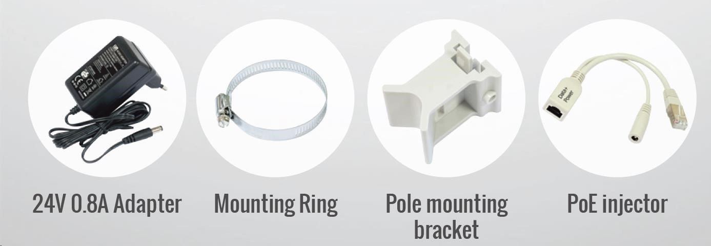 Balenie obsahuje SXT SA ac, injektor PoE, napájací zdroj, montážnu sadu na stožiar