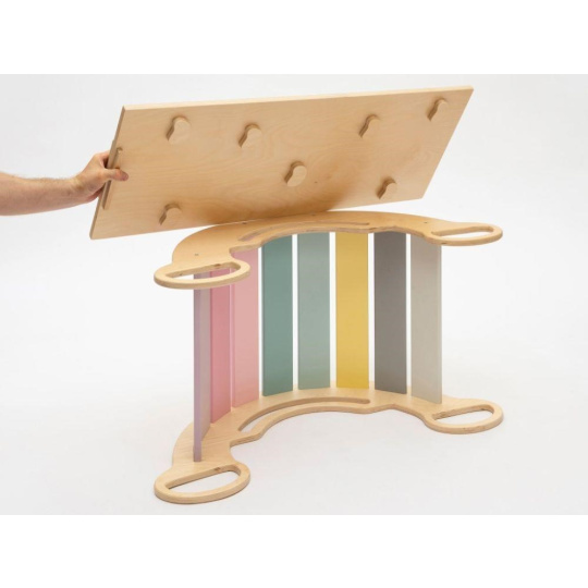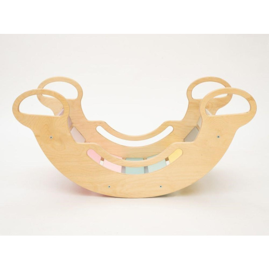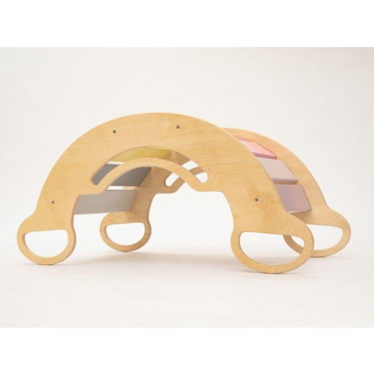 Montessori detská hojdačka smile 6in1 určite vyčarí úsmev na tvári vašej dievčatka alebo chlapca. Svojím dizajnom, pastelovými farbami a širokým úsmevom bude denne lákať deti k zábavnej hre aj príjemnému houpaniu. Jej využitie je všestranné, môže byť hojdačkou, šmykľavkou, lezeckou stienkou, skrýšou aj sedacou časťou, pri doplnení obojstranným doskou aj detským nábytkom. Obojstranná doska nie je súčasťou hojdačky. Vďaka jemným pastelovým farbám je vhodná do každého interiéru. Vyrobená je z tých najkvalitnejších materiálov, ručne dohladka opracovaná a lakovaná farbami s atestom. Montessori hojdačka smile je širšia než naše Montessori hojdačky 5in1, preto k tejto hojdačke ponúkame aj špeciálnu obojstrannú dosku, ktorá je doplnkom ku hojdačkám smile. Vďaka doske jednoducho premeníte hojdačku smile na detský stolík. Obojstranná doska nie je súčasťou hojdačky, pre využitie hojdačky ako nábytku je nutné dosku samostatne dokúpiť.