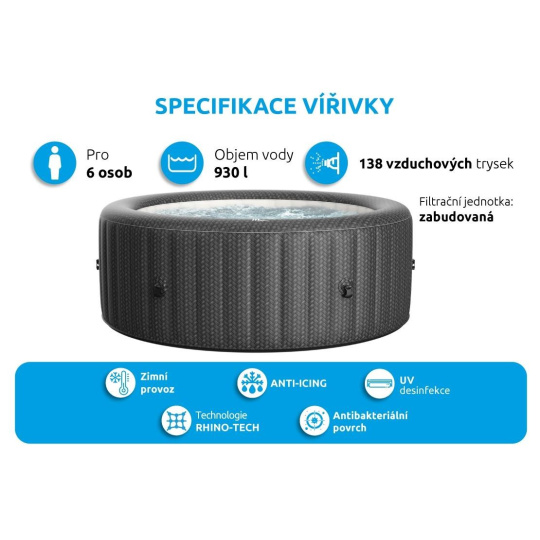 - Masáž vzduchovými tryskami - 360 stupňový systém vzduchových trysiek plní vírivku tisíckami vzduchových bublín, rovnomerne rozmiestnené trysky vypúšťajú bublinky smerom do stredu vírivky, čím vytvárajú rovnomerný celotelový relaxačný zážitok