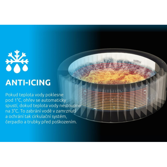 Systém ANTI-ICING bude neustále dohliadať na vašu vírivku a monitorovať bezpečnú úroveň teploty. Ak teplota vody klesne pod 1°C, ohrev sa automaticky spustí, kým teplota vody nestúpne na 3°C. Týmto zabránia zamrznutiu vody a ochránia cirkulačný systém, čerpadlo a trubky pred poškodením.