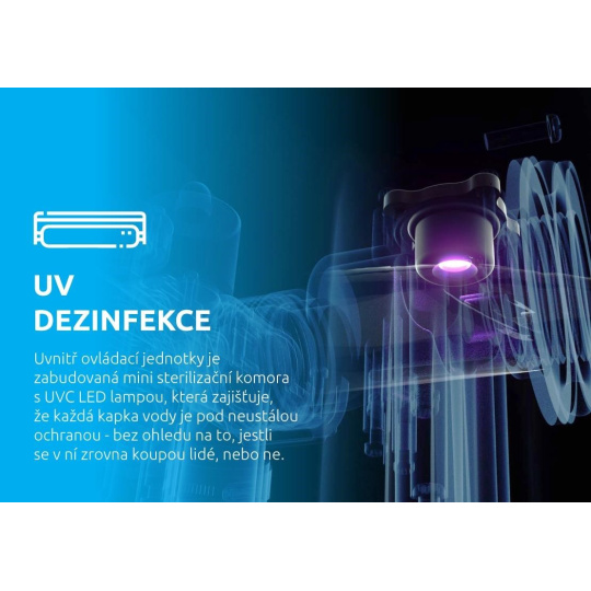 Uvnútri riadiacej jednotky je zabudovaná mini sterilizačná komora s UVC LED lampou, ktorá zabezpečuje, že každá kvapka vody v MSpa je pod neustálou ochranou - bez ohľadu na to, či sa v nej práve kúpu ľudia alebo nie. Testy ukazujú, že táto lampa dokáže za 4 hodiny zabiť 52% baktérií. UV LED lampa nemôže poškodiť vaše oči ani pokožku, pretože je úplne uzavretá vo vnútri čerpadla. Na rozdiel od UVA alebo UVB žiarenia UVC nemá vplyv na životnosť. Vlnová dĺžka UVC žiarenia je starostlivo nastavená tak, aby neovplyvnila životnosť ostatných častí vane. Spotreba tohto UVC systému je veľmi nízka.