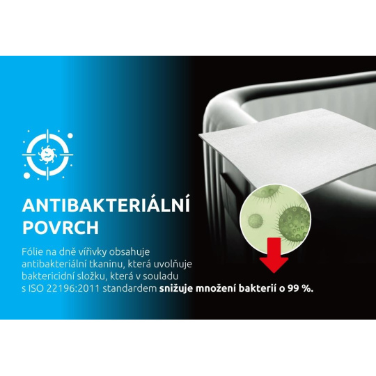 Vnútorná fólia vírivej vane obsahuje antibakteriálnu tkaninu, ktorá uvoľňuje baktericídnu zložku, ktorá v súlade so štandardom ISO 22196:2011 znižuje množenie baktérií o 99%.
