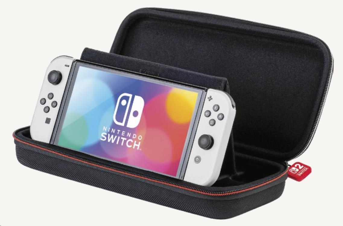 V tomto luxusnom prepravnom puzdre od spoločnosti Nacon môžete bezpečne a pohodlne prenášať nielen novú hernú konzolu Nintendo Switch 2, ale aj hernú konzolu Nintendo Switch alebo Switch – OLED Model. Ústredným prvkom tohto puzdra je nastaviteľná stojanček, ktorý pri hraní umožňuje pohodlnejšie sledovať dianie na obrazovke, zatiaľ čo pri preprave chráni obrazovku aj analógové páčky konzoly pred poškodením. Na jeho vnútornej strane sa navyše nachádza dvanásť kapsičiek na uloženie kariet s vašimi obľúbenými hrami. Súčasťou balenia sú aj dve menšie plastové puzdra na microSD karty.