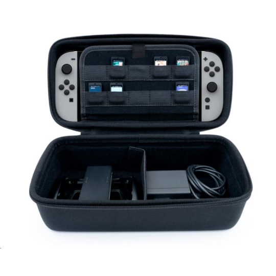 Toto veľké ochranné puzdro od spoločnosti Nacon navrhnuté na mieru pre hernú konzolu Nintendo Switch 2 ocení každý hráč, ktorému nestačí menšie prepravné puzdro určené na prenášanie konzoly so základným príslušenstvom. Oproti nemu ponúka toto väčšie puzdro dostatok miesta nielen pre konzolu a napájací adaptér, ale aj pre HDMI kábel a držiak Joy-Con 2 Grip alebo ovládač Nintendo Switch 2 Pro Controller, prípadne dvojicu ďalších ovládačov Joy-Con 2. Vzhľadom na väčšie rozmery potom toto puzdro obsahuje aj dodatočnú mäkkú výstelku, ktorá na cestách ešte lepšie chráni konzolu aj všetko uložené príslušenstvo. Na spodnej strane veľkého oddielu chrániaceho obrazovku konzoly pred poškrabaním sa navyše nachádza rovných desať kapsičiek pre uloženie kariet s vašimi obľúbenými hrami. Puzdro je zároveň kompatibilné s hernými konzolami Switch, Switch Lite aj Switch – OLED Model.