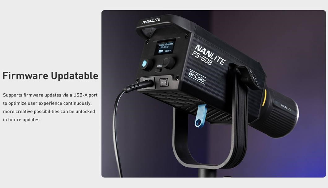 Svetlo FS-60B je ultra kompaktné a dodáva sa s bajonetom FM (rovnako ako svetlo Forza 60) pre veľké množstvo nástrojov na modelovanie svetla spoločnosti Nanlite, ako sú Fresnelové šošovky, softboxy a dáždniky, aby ste mohli svetlo zmäkčiť a modelovať. Súčasťou dodávky je tiež adaptér bajonetu Bowens, ktorý zabezpečuje širšiu kompatibilitu s radom modifikátorov svetla. Do držiaka a adaptéra Bowens sú navyše tiež zabudované držiaky dážnikov, čo poskytuje ešte ďalšie možnosti zmäkčenia svetla.