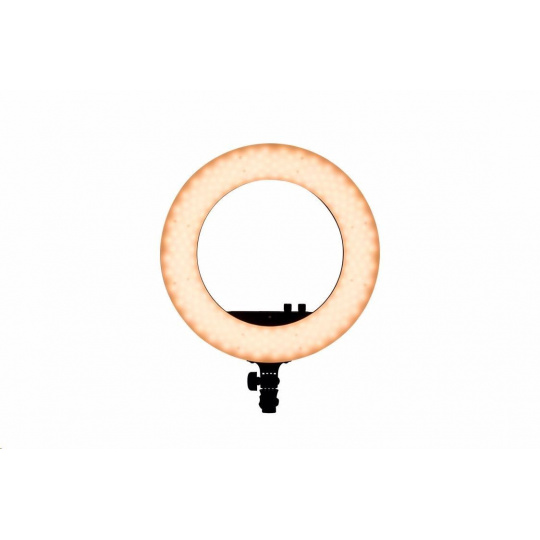 Stmievateľné dvojfarebné LED kruhové svetlo Nanlite Halo 18 s napájaním cez sieťový adaptér. Súčasťou balenia je aj držiak na telefón a obojstranné zrkadlo na make-up.