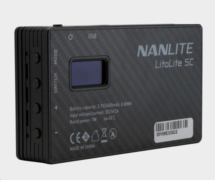 LitoLite 5C je kompaktný LED svetelný panel so zabudovanou Li-Ion batériou, USB-C nabíjaním, úžasným jasom, nastaviteľnou teplotou farieb od 2700K do 7500K s farebným posunom zo zelenej na purpurovú, 360° reguláciou odtieňa so 100 úrovňami nastavenia sýtosti farieb a 15 predprogramovanými, nastaviteľnými špeciálnymi svetelnými efektmi.