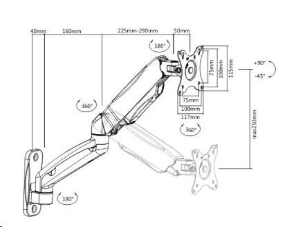 Držiak na monitor Fiber Mounts FM31 Plne polohovateľný držiak na monitor na stenu 17-43", nosnosť 9kg Špičkový nástenný držiak na zavesenie monitorov 17-43", ktorý má neuveriteľný rozsah polohovateľnosti. Monitor zavesený na držiaku Fiber Mounts FM31 môžete otáčať do strán, vysúvať a približovať ku stene, naklápať v obrovskom rozsahu ako nadol, tak aj nahor, meniť výšku až o 25cm, rotať (mať monitor klasicky na šírku alebo ho kedykoľvek obrátiť na výšku). Vynikajúca kvalita zaručuje dlhú životnosť, plynový piest pre výškové polohovanie sa veľmi ľahko nastavuje na požadovanú hmotnosť. Držiak je vybavený krytkami pre vedenie káblov. V balení nájdete súpravu montážnych materiálov. Farebné prevedenie čierne, záruka 2 roky. Držiak na monitor TV na stenu 17-43" s obrovskou škálou polohovania Fiber Mounts FM31 Technické údaje: na monitory aj televízory s hmotnosťou 2-9kg VESA štandard 75x75 a 100x100 (možnosť rozšírenia) odporúčame na monitory aj televízory s uhlopriečkou 17" až 43" vhodný na klasické rovné, ale aj zahnuté monitory a televízory otáčanie do strán +/- 90° naklápanie +90° / -45° výsuv od steny 90mm až 540mm rotácia 360° systém pre vedenie káblov špičková konštrukcia ľahké nastavenie plynového piestu na požadované zaťaženie montážny materiál farebné prevedenie čierne záruka 2 roky Držiak na monitor televízie na stenu Fiber Mounts FM31 Držiak na monitor na stenu Fiber Mounts FM31 podporuje VESA štandardy: VESA 75x75 VESA 100x100