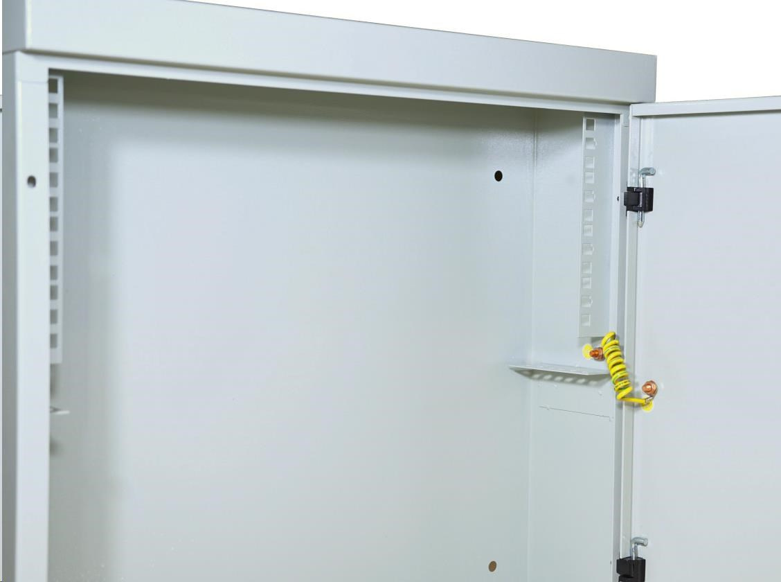 dvierka nie sú perforované, takže sa do skrinky nič nevtlačí a zároveň sa v nej nenachádzajú žiadne LED diódy aktívnych prvkov, čo je nežiaduce. Dvere sú spojené so skeletom pomocou uzemňovacieho kábla.