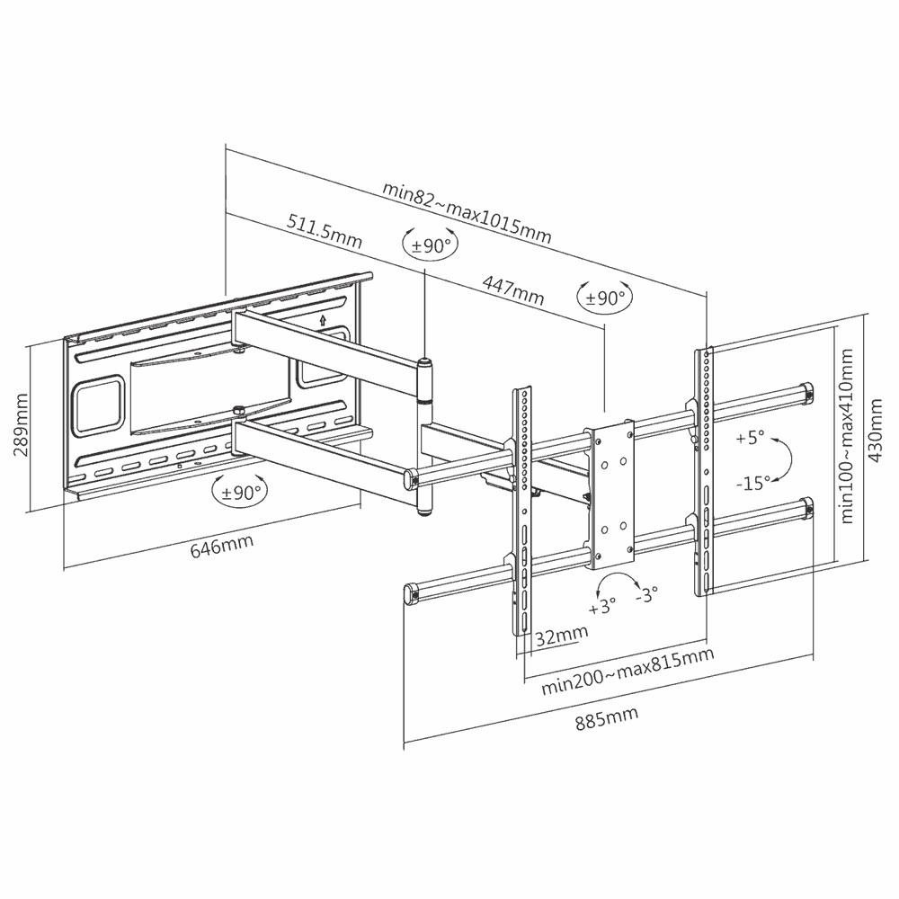 Najdlhší držiak televízie Fiber Mounts Big1 Nastaviteľná vzdialenosť od steny 82mm až 1015mm, otáčanie kolmo k stene Televízor s uhlopriečkou 43-80", naklápanie +5° až -15°, korekcia roviny +/- 3°, podporuje VESA štandardy 200x100 až 800x400, nosnosť 50kg Najdlhší držiak na otáčanie veľkých televízorov aj kolmo k stene. Vďaka nastaviteľnej vzdialenosti od steny 82mm až 1015mm umožňuje držiak Fiber Mounts Big1 otočenie o 90° na obidva smery aj televízorov s uhlopriečkou 43" až 80". Vysoká nosnosť 50kg zabezpečuje bezpečné zavesenie a polohovanie aj naozaj veľkých televízorov. Konštrukcia držiaka Big1 je oceľová, nástenný držiak o rozmeroch 646x289mm zabezpečí vynikajúce rozloženie celej hmotnosti na stenu. V balení nájdete montážny materiál. Záruka 3 roky. Najdlhší otočný držiak na Televízie Fiber Mounts Big1 Technické údaje: nosnosť 50kg pre televízory s roztečou VESA 200x100 až 800x400 zavesenie a otáčanie kolmo k stene Televízora 43" až 80" nastaviteľná vzdialenosť od steny 82mm až 1015mm možnosť naklápať televízor +5° až -15° korekcia roviny obrazovky +/- 3° inštalačný materiál súčasť balenia (viď nižšie) veľmi pevná a bezpečná konštrukcia zaistenie Televízora na držiaku proti vysadeniu materiál oceľ hmotnosť držiaka 13,5kg veľká inštalačná plocha pre rozloženie hmotnosti na stene 646 x 289mm farebné prevedenie čierne záruka 3 roky Fiber Mounts Big1 Vám otočí kolmo na stenu aj veľmi veľké televízie Držiak Fiber Mounts Big1 podporuje VESA štandardy: VESA 200x100 VESA 200x200 VESA 300x200 a 200x300 VESA 300x300 VESA 400x200 a 200x400 VESA 400x300 a 300x400 VESA 400x400 VESA 600x400 VESA 800x400 Najdlhší držiak na televízory Big1 má aj bezpečnostný systém na zabezpečenie televízie na držiaku Inštalačný materiál, ktorý nájdete v balení s držiakom Fiber Mounts Big1: hmoždinky o12x60 6ks vruty do hmoždiniek 8x90 mm 6ks podložky na vruty 6ks šrouby M5x14 4ks šrouby M6x14 4ks šrouby M6x30 4ks šrouby M8x30 4ks šrouby M8x50 4ks univerzálne podložky na šrouby 4ks distančná podložka 5mm 8ks distančná podložka 10mm 8ks V prípade, že dodávané šrouby nebudú vhodné na uchytenie televízora (ani pri použití podložiek alebo dĺžkových válečkov), je nutné zmerať potrebnú dĺžku a priemer šroubov a zakúpiť ich v obchode (napr. železiarstvo, v náradí a pod.). Fiber Mounts Big1 je najdlhší otočný držiak na veľké televízie Televízny držiak Fiber Mounts Big1 je ideálny na možnosť otáčania stredne veľkých a veľkých televízií (43" až 80") na obe strany (napr. z obývačky do kuchyne a pod.). Otáčanie je možné až o 90° na obe strany, teda kolmo k stene. Vynikajúca bezpečnosť a stabilita je zabezpečená silnostennou oceľovou konštrukciou (hmotnosť držiaka 13,5kg), o výborné rozloženie celkovej hmotnosti na stene sa postará veľká inštalačná plocha s rozmermi 646 x 289mm.
