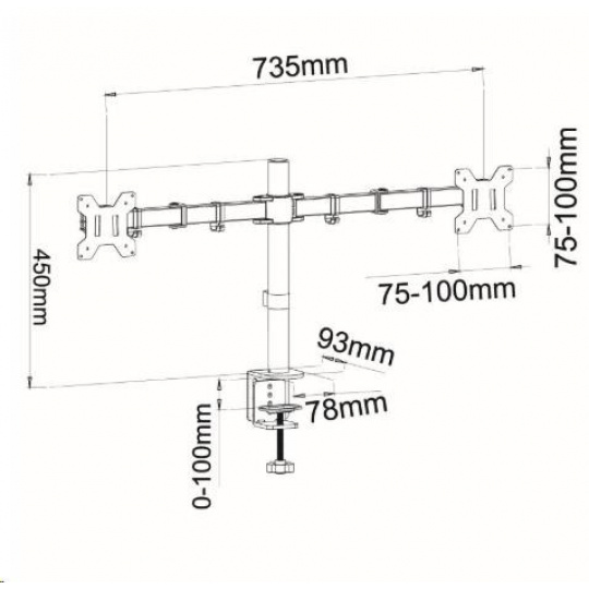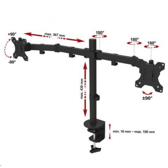 Najlacnejší dvojmonitorový držiak ErgoSolid FN40 Lacný, no stále vynikajúcej kvality, držiak na 2 monitory do kancelárií, školských učební, firiem a podnikov - plne nastaviteľný, záruka 5 rokov Aj vynikajúci držiak môže byť lacný - ponúkame Vám za bezkonkurenčnú cenu stolný dvojmonitorový držiak pre monitory 13-29" s nastavením vzdialenosti, výšky, náklonu, otáčaním do strán a funkciou pivot (otočenie monitora na šírku alebo na výšku). Držiak má veľmi pevnú spoľahlivú konštrukciu z ocele. Dodávaný je v čiernom prevedení a v balení nájdete okrem inštalačného materiálu aj 2 typy úchytov na stolovú dosku (na okraj stolu pomocou sťahováku a do priestoru stola pomocou skrutkice - nutné vyvŕtanie 1 otvoru s priemerom 8mm). Na držiak poskytujeme záruku 5 rokov. Ergosolid FN40 - precízny držiak na 2 monitory za najlepšiu cenu - nastavenie 3D, záruka 5 rokov - držiak do kancelárie, do školy, učebne, firmy alebo podniku Za kvalitu držiaku plne ručíme, nebudete-li spokojní, môžete nám tovar vrátiť do 30 dní od kúpy. Táto záruka platí aj pri nákupe na IČO. Najlacnejší dvojmonitorový držiak - zavešenie 2 monitorov, nastavenie 3D, TOP kvalita za bezkonkurenčnú cenu - držiaky Ergosolid FN40 Technické údaje: celková nosnosť 20kg maximálna hmotnosť 1 monitora 10kg podporuje VESA štandardy 75x75 a 100x100 univerzálny, vhodný na zavešenie monitorov s uhlopriečkou 13 až 29 palcov nezávislé nastavenie každého monitora otočenie do strán +/- 180° náklon +/- 45° funkcia PIVOT - otočenie monitora na šírku alebo na výšku nastavenie vzdialenosti monitora od úchyte dĺžka ramena 367mm 3 kĺby pre nastavenie polohy na každom ramene nastaviteľná výška ramien max. 430mm uchytenie na stolové dosky pri priemere 10mm až 100mm balenie obsahuje 2 typy uchytenia na stolové dosky (sťahovák + skrutkica) materiál oceľ farebné prevedenie čierne balenie obsahuje inštalačný materiál návod na inštaláciu v CZ záruka 5 rokov Najvýhodnejší dvojmonitorový držiak s 3D nastavením polohy monitora. Bezpečná a spoľahlivá konštrukcia, 2 typy uchytenia na stolové dosky s priemerom 10-100mm. Držiak podporuje VESA štandardy pre uchytenie monitora: VESA 75x75 VESA 100x100