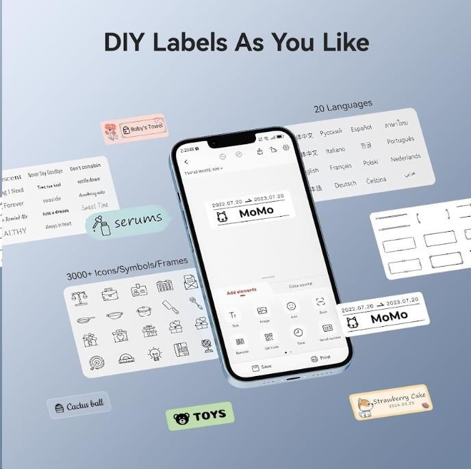 Pri navrhovaní štítku môžete použiť rôzne písma, tvary, ikony, veľkosti a formáty, aby ste si vytlačili etikety alebo štítky podľa svojej predstavy. Môžete importovať fotografie z vášho telefónu alebo obrázky z internetu, aby bol dizajn jedinečnejší. Bezplatná aplikácia pre iOS alebo Android ponúka viac než 1500 ikoniek, viac než 100 rámčekov, 19 fontov písma a umožňuje aj tlač QR kódov. Môžete si vybrať z rôznych štýlov písma, veľkostí a formátov, aby ste si vytlačili etikety alebo štítky presne podľa svojich predstáv. Tlačiareň automaticky rozpozná vložené štítky a aplikácia prispôsobí rozmery pre tlač.