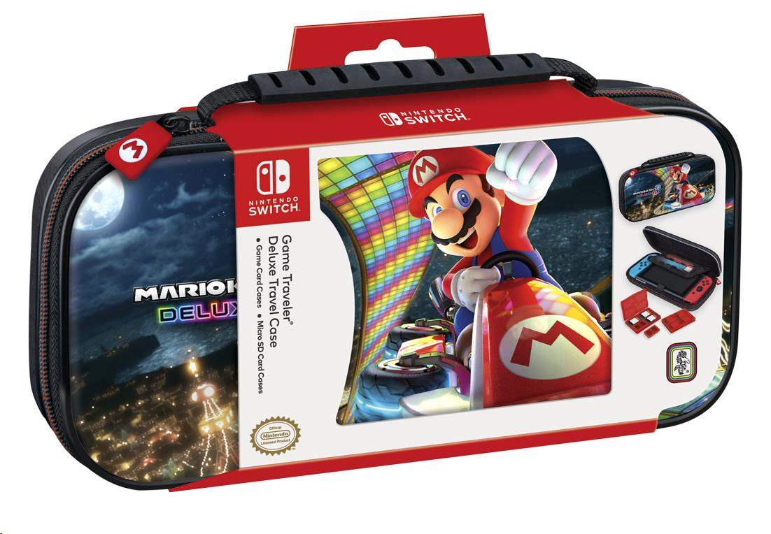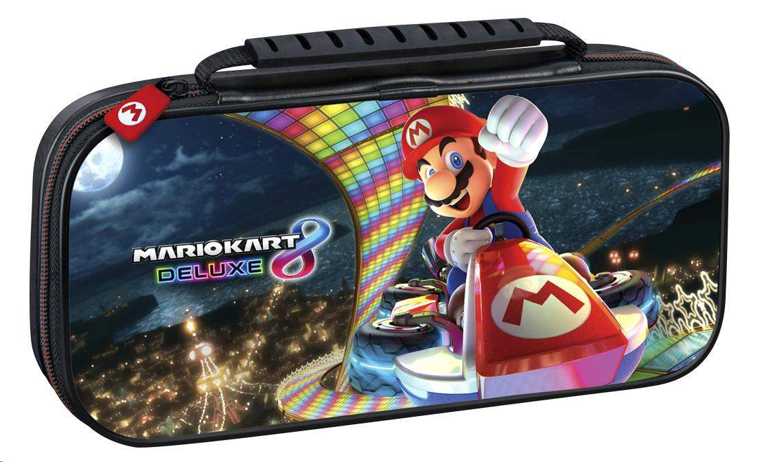 Luxusní cestovní pouzdro NNS50 s motivem Mario Kart 8 Deluxe V tomto luxusním cestovním pouzdru s motivem závodní hry Mario Kart 8 Deluxe můžete bezpečně a bez obav převážet svou oblíbenou herní konzoli Nintendo Switch, Switch Lite nebo Switch – OLED Model. Nedílnou součástí tohoto pouzdra je polohovatelný stojánek, který vám při používání konzole umožňuje upravit pozici obrazovky podle potřeby. Když později uložíte konzoli zpět do pouzdra, ochrání stojánek její obrazovku před poškrábáním. Třešničkou na dortu pak je přívěsek na jezdci zipu s Mariovým logem v podobě písmene „M“. Balení rovněž obsahuje dvě plastová pouzdra na herní karty, z nichž do každého se vejdou čtyři herní karty, a také dvě plastová pouzdra na microSD karty, přičemž do každého z těchto menších pouzder se vejdou dvě microSD karty a každé z těchto pouzder se vejde do libovolné pozice ve větším pouzdru na herní karty. SPECIFIKACE PRODUKTU: Výrobce: R.D.S. Industries Distributor: Bigben Interactive Distributor v ČR: HYPE Kategorie: herní příslušenství Platforma: Switch, Switch Lite & Switch – OLED Model.