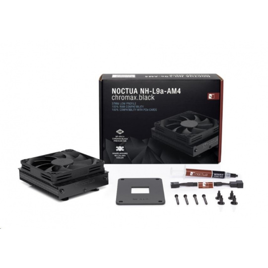 NH-L9a-AM4 chromax.black je celočierna verzia obľúbeného, vysoko kompaktného a tichého nízkoprofilového chladiča NH-L9a-AM4, navrhnutého na použitie v nízkofaktorových zostavách a HTPC prostredí. Hoci poskytuje vysoko kvalitný výkon, je nevhodný pre overclockery a odporúča sa len pre CPU/APU do 95W TDP. Navštívte stránky výrobcu, http://noctua.at/en/nh_l9a_am4_tdp_guidelines, aby ste zistili, či je tento chladič vhodný pre váš procesor.
