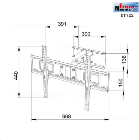 Technické údaje: maximálne zaťaženie 45kg podporuje VESA štandardy 75x75 až 600x400 odporúčame na televízory s uhlopriečkou 37 až 70" vhodný na všetky typy a značky televízorov s podporou VESA nastaviteľná vzdialenosť od steny minimálna vzdialenosť 70mm maximálna vzdialenosť 460mm otáčanie do strán +/- 75° náklon nahor alebo nadol +10° až -20° možná úprava roviny obrazovky po montáži veľmi pevná a robustná konštrukcia bezpečné upevnenie televízora, zabezpečenie proti vysadeniu materiál oceľ inštalačný materiál farebné prevedenie čierne záruka 3 roky Otočný držiak LCD Fiber Mounts DT723 podporuje uchytenie TV štandardy VESA: VESA 75x75 VESA 100x100 VESA 200x100 a 100x200 VESA 200x200 VESA 300x100 a 100x300 VESA 300x200 a 200x300 VESA 300x300 VESA 400x100 a 100x400 VESA 400x200 a 200x400 VESA 400x300 a 300x400 VESA 400x400 VESA 600x400