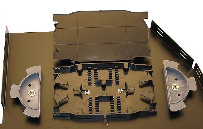19" rack, 1U, pre 24 SC alebo duplexné LC simplexné adaptéry, čierna farba, kovové puzdro, 24 spojovacích zásobníkov