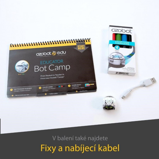 Ozobot Evo, skladacia herná plocha, ochranný skin, 4 farebné fixky, cestovné vrecúško, napájací kábel (micro USB)