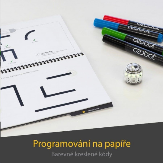 Samozrejmosťou je ľahké programovanie vo webovom editore OzoBlockly aj kreslenie klikatých dráh s ozokódmi pomocou fixiek, ktoré výrobca nezabudol pribaliť. Zvýšený počet spodných senzorov spoľahlivo dohliadne na sledovanú čiaru a nové infračervené senzory upozornia robota na všetky prekážky na ceste, takže neutrpezlivo nenarazí do iného Ozobota Evo. Radšej si s ním pekne pokecá.