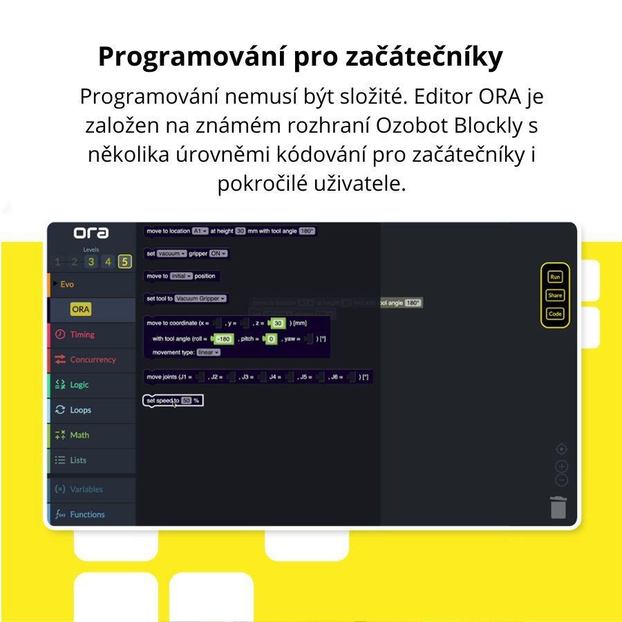 Pri výške takmer tri štvrtiny metra má plne vysunuté rameno ORA polomer dosahu 440 mm. Je vybavené prstovým a vakuovým úchopom, aby bolo schopné zdvíhať, presúvať a manipulovať s predmetmi vo svojom okolí. Vďaka šiestim nezávisle ovládateľným osám môžu študenti naprogramovať ORA tak, aby pracovala takmer v ľubovoľnej polohe a splnila akúkoľvek úlohu alebo výzvu, s ktorou sa stretnú. Vďaka konštrukcii plug and play je kobota ľahko zprovozniteľná pomocou priloženého napájacieho zdroja, núdzového zastavenia a montážneho príslušenstva. A ani jej programovanie nie je nerešitelnou rébou. Programy pre robotické rameno budete vytvárať v blokovom Ozobot Editoru, ktorý je založený na známej rozhraní Ozobot Blockly. Rozlišuje niekoľko úrovní kódovania, aby prácu v ňom zvládli ako začiatočníci, tak aj pokročilí používatelia. Tento editor je tiež možné prepnúť na programovací jazyk Python.